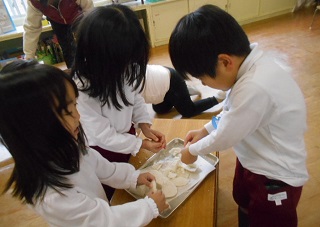子どもたちは「幼稚園で、いっぱい遊べますように」「小学校で友達がたくさんできますように」など、一人一人願い事を言葉にし、木槌で鏡餅を叩いて割りました。割った鏡餅を触ってみて「カチカチや」「ここはふわふわしてて、パンみたい」と思い思いに感じたことを友達同士で話していました。