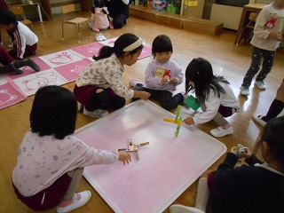 年が明けて、初めての未就園児園庭開放「みんなおいで—」がありました。今日は、ぴょんぴょんくらぶ(未就園児活動)の子どもたちも参加し、在園児と一緒にコマ回しをしたり、音楽に合わせてリボンでダンスをしたりして好きな遊びを思う存分楽しみました。5歳児は、自分たちがつくった手作りコマを持ってきて、未就園児の友達に手作りコマの回し方を教えてあげている子どももいました。そして「おもちゃのチャチャチャ」の歌を聞いてもらったり、コマ回しをみせたりして、未就園児の子どもたちに、手作りコマをプレゼントしました。
