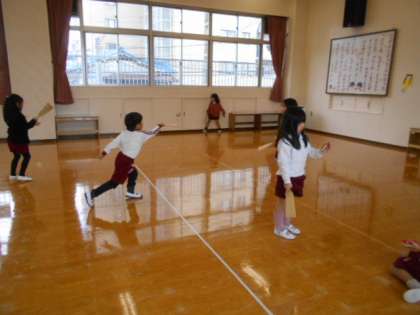 また、リズム室では、羽子板をして遊びました。羽がたくさんないので、どうなるかな?と思っていましたが、すぐに友達を誘い、2人一組になり羽つきを楽しみました。始めは空振りしていた子どもも、だんだん遠くまで羽が飛ばせるようになっていましたよ。