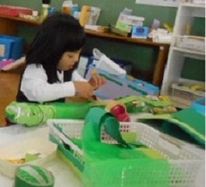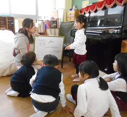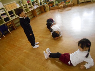 もも組では、「大きなカブ」のお話の中で、イメージを膨らませながら、カブの種になって転がったり、大きなカブに生長したり、登場人物になりきったりと、体を使って表現することを楽しんでいます。「大きなカブつくろう!」「葉っぱがいるよ」「みんなで引っ張れるように長い葉っぱがいいね」「カップをつなげたらいいんじゃない?」などと劇に必要なものやアイデアもどんどんでてきています。のびのびと表現することを楽しみながら、教師や友達と一緒にイメージを共有して遊ぶ楽しさを感じでほしいなと思います。