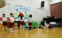 そら組は、「ジャックと豆の木」のお話に親しみをもち、ジャックや牛、魔法の豆、大男などいろいろな登場人物になって、表現することを楽しみました。また、登場人物だけでなく大道具を動かす役割も担い、クラスの友達と思いを合わせて劇遊びを楽しみました。