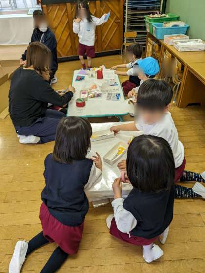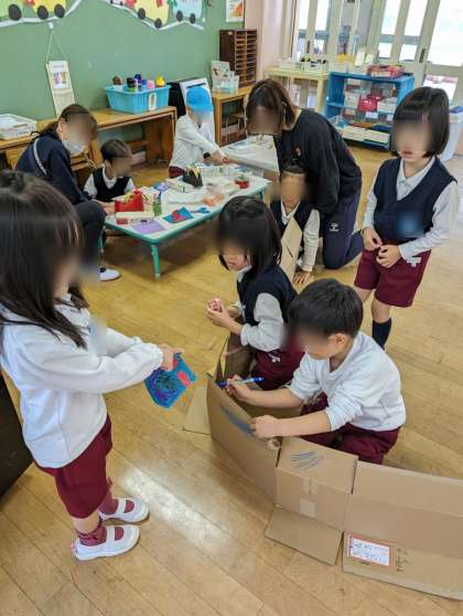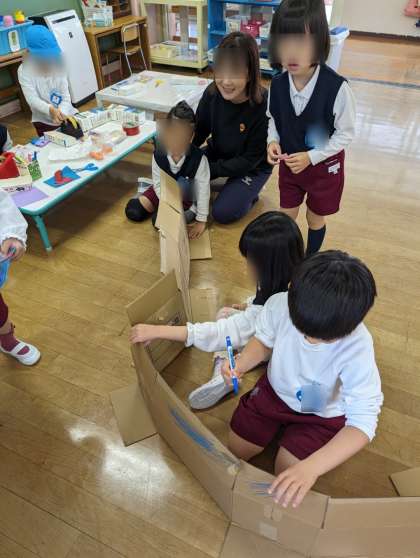今日は朝から雨でした。そら組の子どもたちは段ボールでお家(の壁)をつくったり、色々な材料で好きなものをつくったりして遊んでいました。雨でもみんな元気に遊んでいました!
