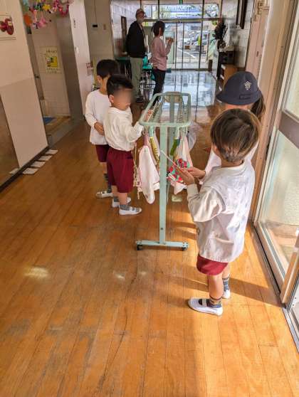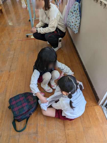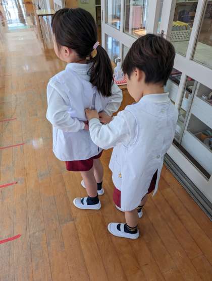 今日からもも組さんも元気に登園!そら組さんが朝(や帰りの)の用意を手伝ってくれました。優しく片付ける場所を教えてくれたり、エプロンのぼたんを外してくれたり、と素敵なお兄さん、お姉さんでした。