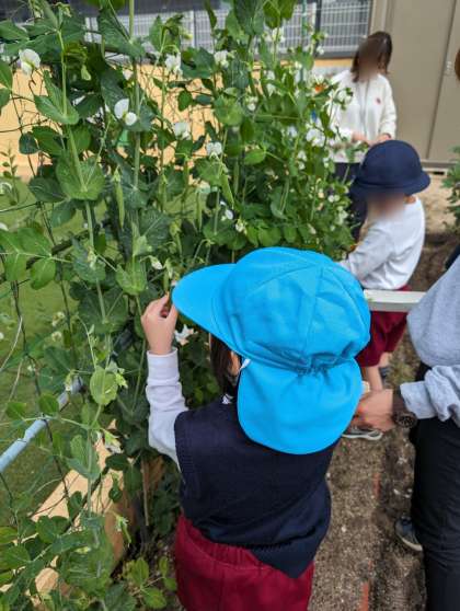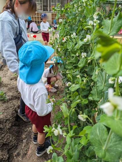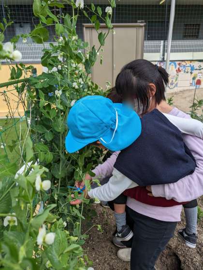 そら組さんがスナップエンドウを収穫しました。大きくふくらんでいるのを探して収穫していきました。明日はもも組さんが収穫かな?楽しみですね。