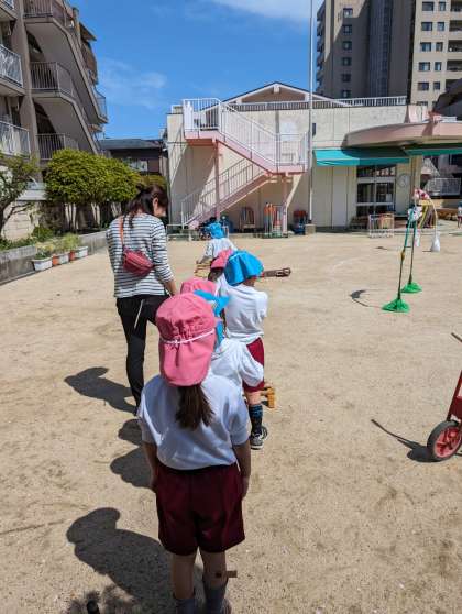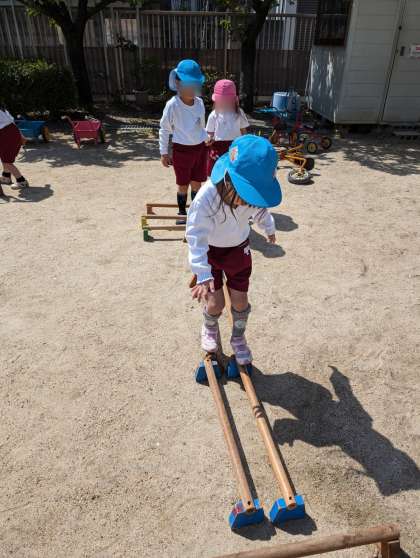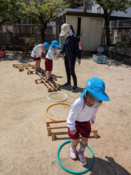 S棒やフープを自由に並べて道ができました!さあ、落ちないように渡れるかな?