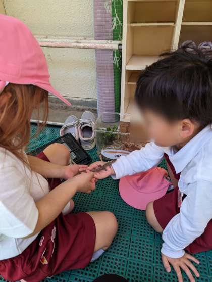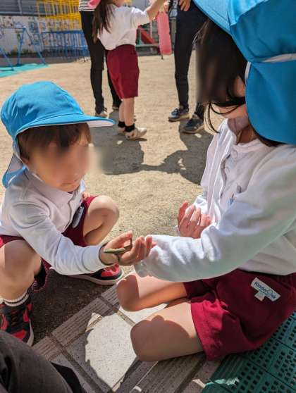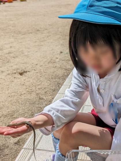 とてもいい天気だったので、カナヘビさんも日向ぼっこ。「これ、なに?」「トカゲ?」「触りたい!」とそら組さんももも組さんも優しく手に乗せていました。カナヘビさんと仲良しになれたかな?