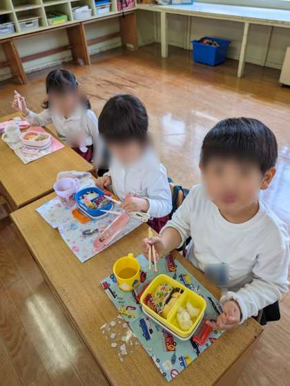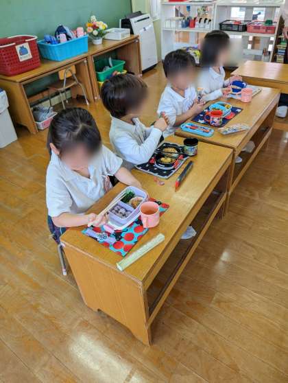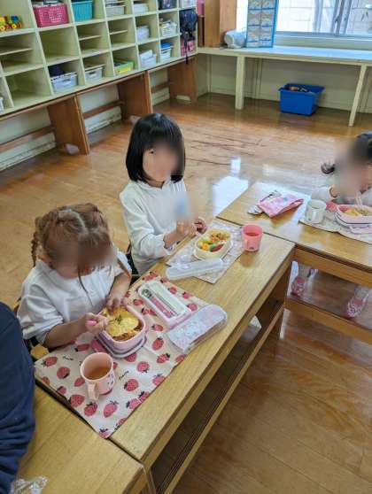 初めてのお弁当はそら組さんと一緒に食べました。用意も一緒にして、楽しいお弁当タイム♪