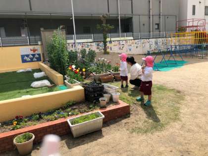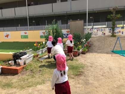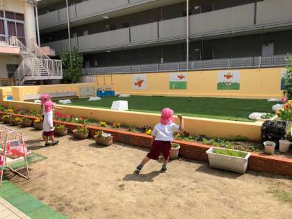幼稚園の園庭にちょうちょが遊びにきてくれました。もも組の子どもたちが発見して、一生懸命追いかけていました。また遊びに来てねー!