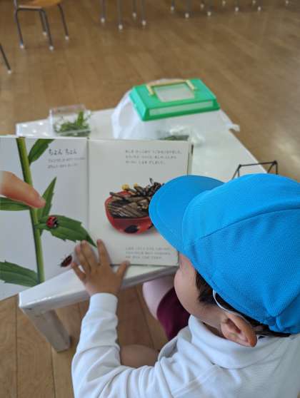 テントウムシ観察中。幼虫や、たまごにも興味津々。見てる間にサナギから孵りました。孵ったばかりのテントウムシは黄色くて、だんだん赤くなっていくことも絵本で確認しました。不思議ですね。