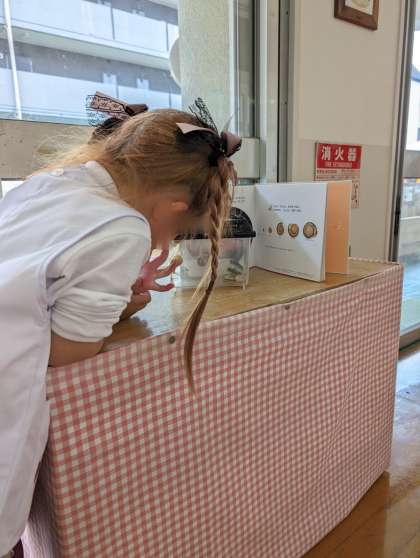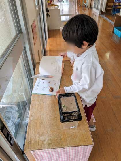 もも組さんが代わる代わるにカタツムリを見ていました。「うんちしてるなあ」「ぐい〜んて伸びてる」「かわいいね」絵本と見比べながらじっくりと見ている姿もありました。