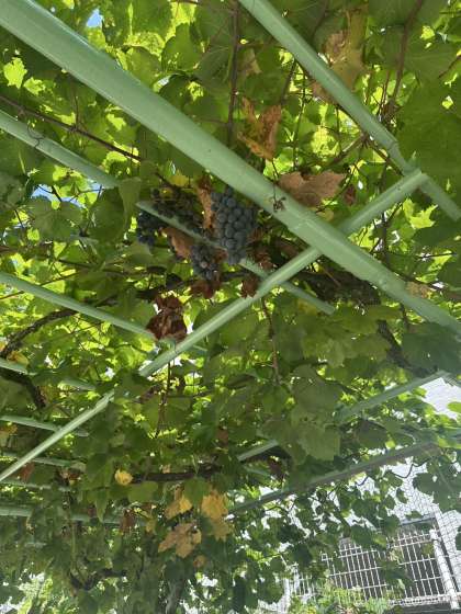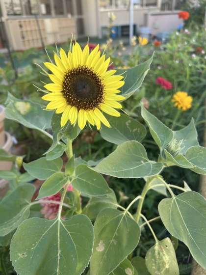 園庭のヒマワリが咲き始め、砂場の上のブドウもなっていました。セミやチョウ、トンボも来て、幼稚園のお庭は毎日にぎやかです!
