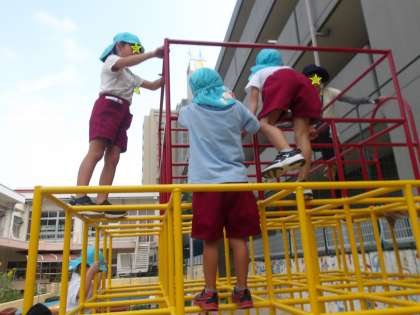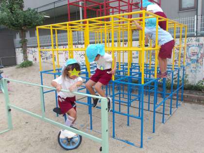 今日も暑い日でしたが、朝一番の少し涼しい時間を使って、園庭で元気に遊びました。一輪車や、ぱかぽこ、青虫ペダル、ジャングルジム、、、みんな自分で「やってみるわ!」「ちょっとできるようになってきた!先生見て!」とやる気満々で楽しんでいました。暑さに気をつけながら、いっぱいチャレンジしながら遊ぼうね。
