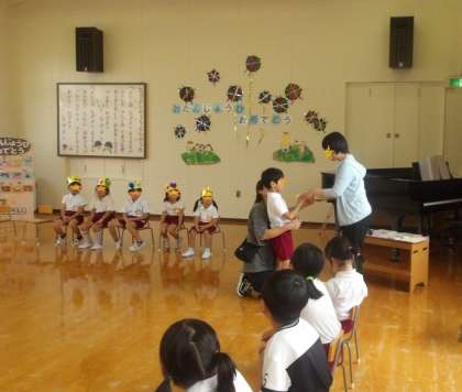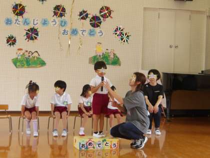 誕生会 公開日 2025/08/29 更新日 2025/08/29 子どもの姿 今日は7,8.9月生まれのお友達の誕生会でした。みんな少し緊張しながらも、頑張って自己紹介をしていました。おうちの方からおめでとうのメッセージをもらって嬉しそうでした。もも組さんからキラキラハートの冠をもらったり、誕生絵本をもらったりして、みんなにお祝いをしてもらって、最後にはおうちの方と一緒にふれあい遊びをして楽しい一日になりました。 いいね(0)
