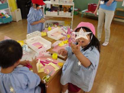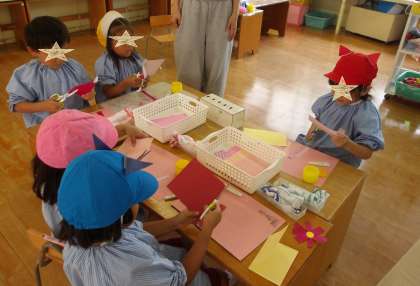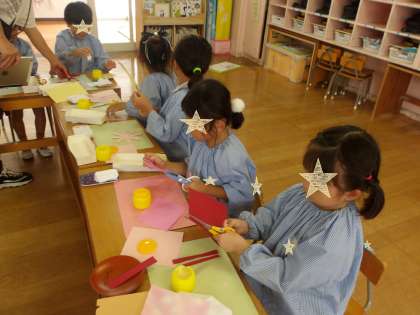 苗植えの後、早速画用紙や折り紙を使ってコスモスのお花を作っていました。さっき植えたお花と同じだね。かわいいコスモスがたくさんできました。もも組さんがうれしそうにできたコスモスをそら組に見せにいっていました。「かわいいのできたね」「すてきだね」と言われてニコニコのもも組さんでした。そら組さんは花びらの先を「ギザギザハサミ」で切ることもしていました。