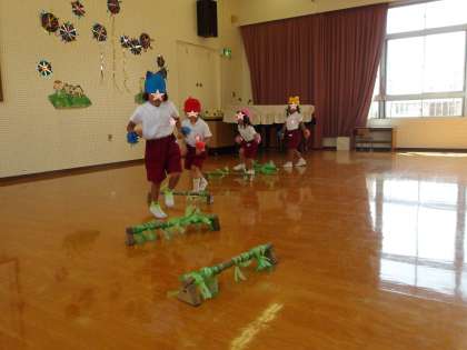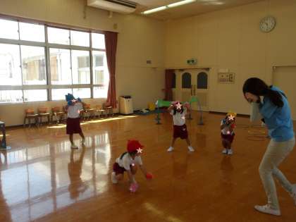 もも組さんはネコごっこが大盛り上がり。自分たちで耳をつけたり、遊び道具やごはんを作ったりして楽しんでいます。今日はネコになってサーキット遊びやダンスをしました。ネコになりきってかわいいポーズを見せてくれたり、草を飛び越えたり、トンネルをくぐったりしてとても楽しそうでした。