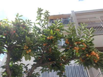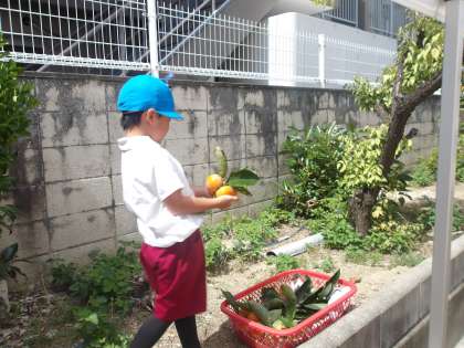 園庭の柿が色づいてきました。幼稚園の柿は「西村早生」という少し早くできる柿のようです。まずは第1弾で色づいたものを収穫していきました。