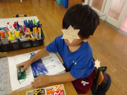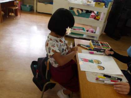 もも組が運動会で飾る万国旗の絵をかきました。今運動会に向けて活動していることをかいていました。そら組に見せに行ったり、お部屋に飾ってもらったりして嬉しそうでした。