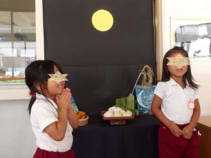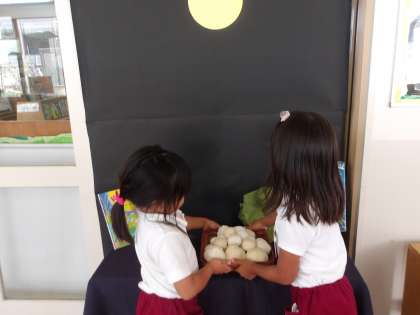 完成したおだんごをお供えしました。もも組のお友達が丁寧に運んでくれましたよ。お月様にお願い事もしようかな?