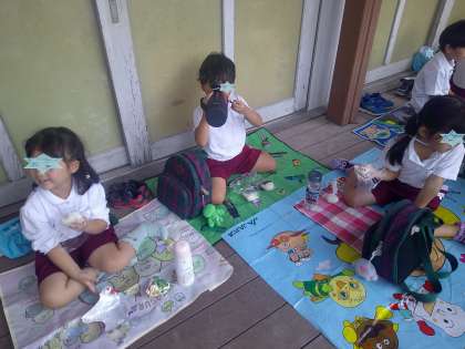 たくさん遊んだ後は、お弁当タイム。ウッドデッキをお借りして一緒に食べました。