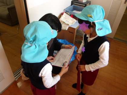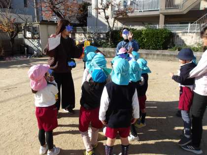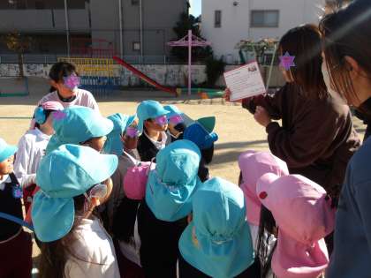 12月に入り、子どもたちはサンタさんに手紙をかきました。それを自分たちで作った「サンタポスト」に投函。次の日には手紙が消えているのに気づいて「手紙無くなってる!」「サンタさんもっていった!」と大喜び。そこから数日たち、園庭で遊んでいると何かが落ちていることに気付きました。「あ!サンタさんからの手紙や!」と大喜び。みんなに知らせにいっていました。先生が英語でかかれた中の手紙を読み、、、「お楽しみ会の日に幼稚園に来てくれるってかいてあるよ」と言われてさらに大喜び!空を見上げてお礼を言っていました。お楽しみ会楽しみですね。