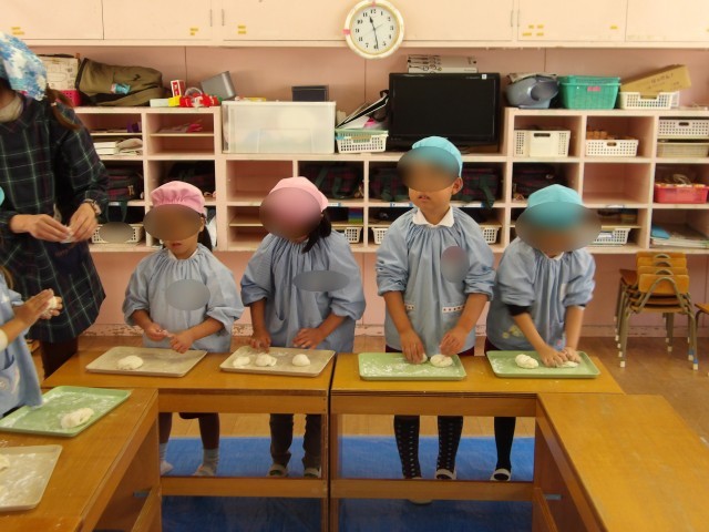 できたお餅をみんなで分けて、自分用のかわいい鏡餅を作りました。「あったかいね」「柔らかい!」と嬉しそうな子どもたちでした。一人一人が思い思いの鏡餅をつくることができました。お手伝いくださった保護者の皆様ありがとうございました。