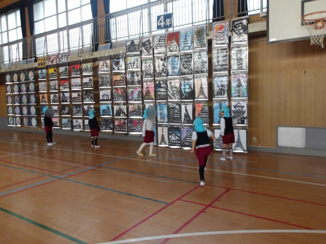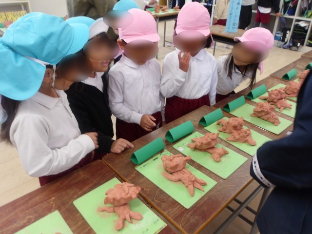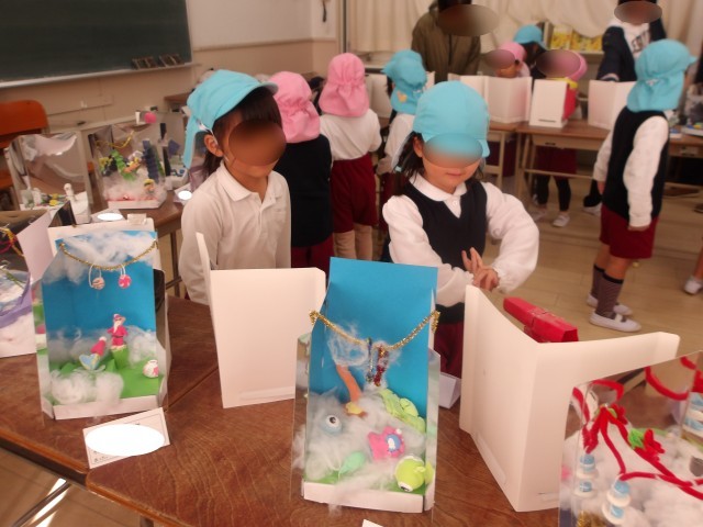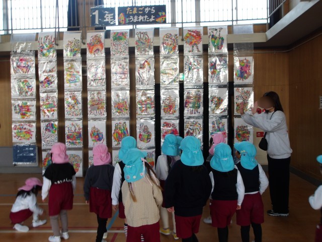 11月・12月あ」「と、地域の小学校の作品展に行かせてもらいました。「すごいなあ」「これかわいい!」「これとこれが一番好きやねん」と、お兄さんお姉さんがつくった作品や絵に興味をもってよく見ていました。また、「これやってみたい」「つくってみたい」と小学生の作品に憧れと刺激を受け、「やりたい」意欲も高まっていました。様々な機会を意識して、地域の小学校との交流をもつことで、小学校ってこんなところなんだな。こんなことができるんだな。などといった親しみの気持ちも生まれ、就学に向けての安心にもつながると思っています。