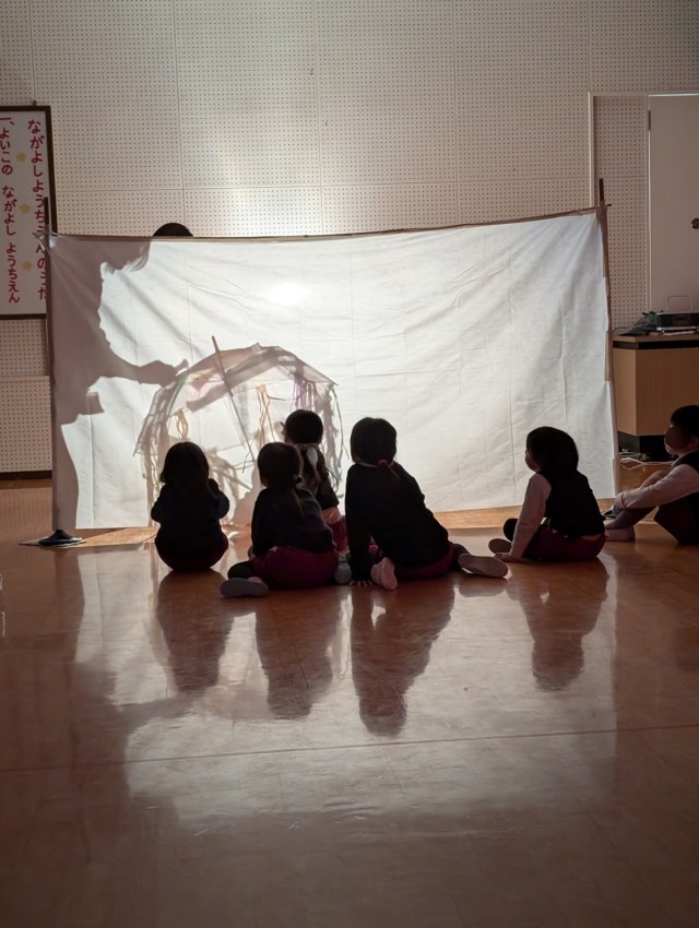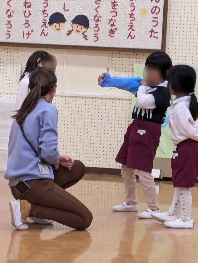 そら組さんももも組さんもそれぞれ大好きなお話の世界で遊んでいます。お話に出てくる動物になって言葉を考えたり、動きを工夫したりしてみんなとても楽しそうです。子どもたちの「こんなふうにしたい」「こうしたらおもしろい」を大切にして劇遊びを楽しんでいきたいと思っています。