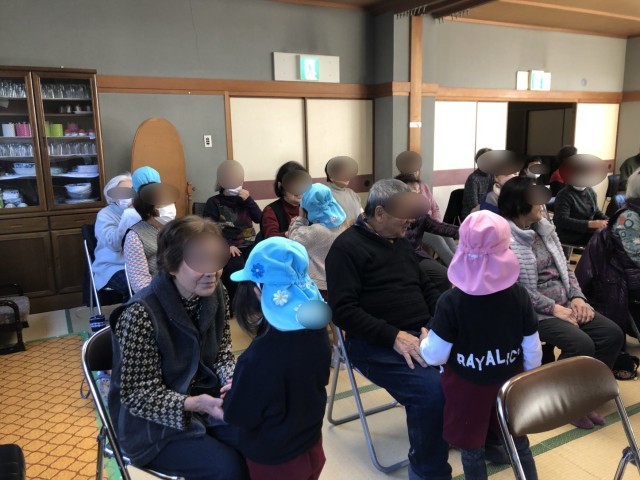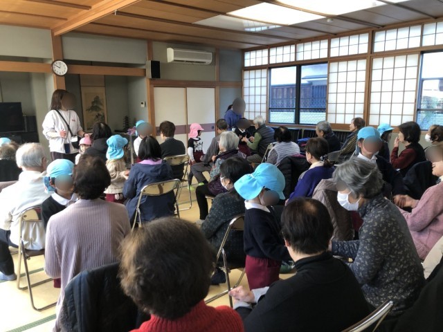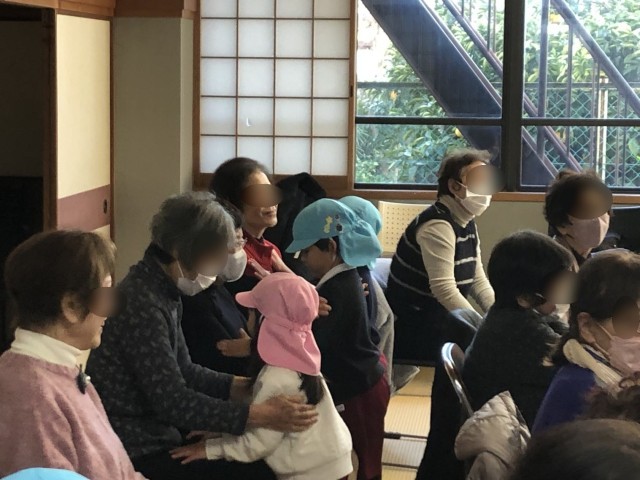 今月も、そら組さんもも組さん一緒にいこいの家に行きました。「おおさむこさむ」の歌を歌ったり、「こすれこすれ」のふれあい遊びを一緒に楽しみました。地域の方にいつもあたたかく受けとめてもらい、1学期にはとても緊張してふれあいをしていた子どもたちも、回数を重ねるごとに親しみの気持ちが育ち、とても自然にふれあったり、安心して一緒にする姿が見られています。