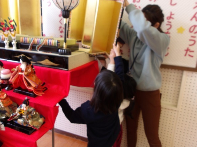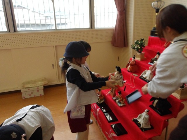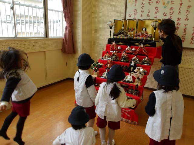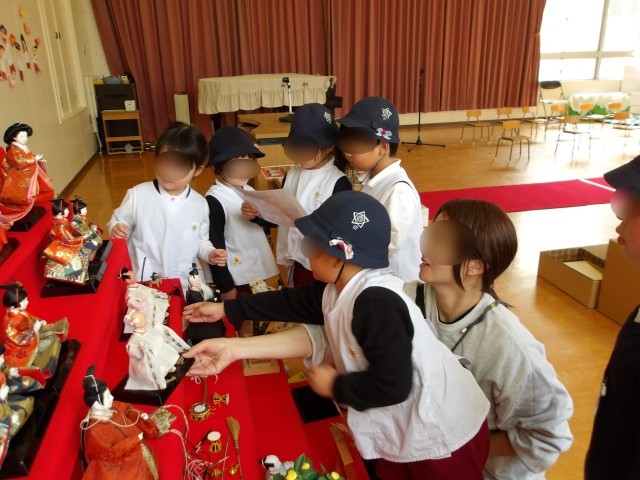 2月20日 みんなでひな人形をかざりました。丁寧に箱から出して、飾り方の写真を見ながら「ここかな?」「こっちかな?」と飾っていっていました。いろいろな道具や、人形に興味津々。飾り終わってみんなでじっくりと飾りを見ました。きれいですね。