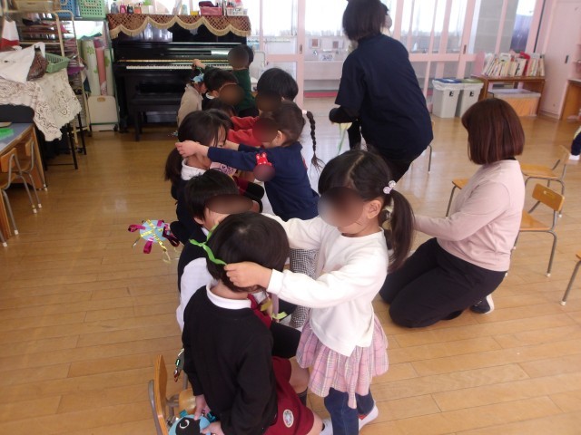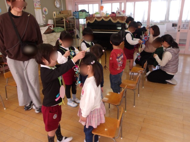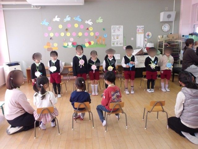 そら組さんがぴょんぴょんのお友達にプレゼントを渡しに行きました。ぴょんぴょんさんもプレゼントを用意してくれていました。お互いにプレゼントしあって、素敵な笑顔でした。また一緒に遊べたらいいね。