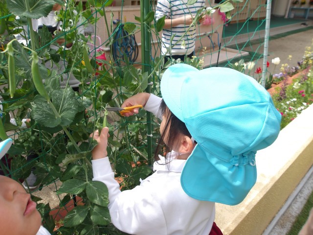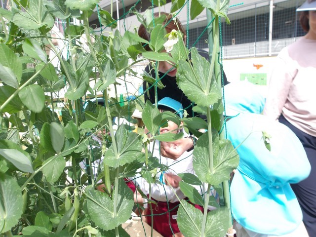 園庭のスナップエンドウが大きくなってきました。今日はそら組さんが収穫です。「どれがおいしそうかな?」と子どもたちが目で見て、触って選びました。袋に入れて、みんなとっても嬉しそう。おいしく食べてくださいね♪