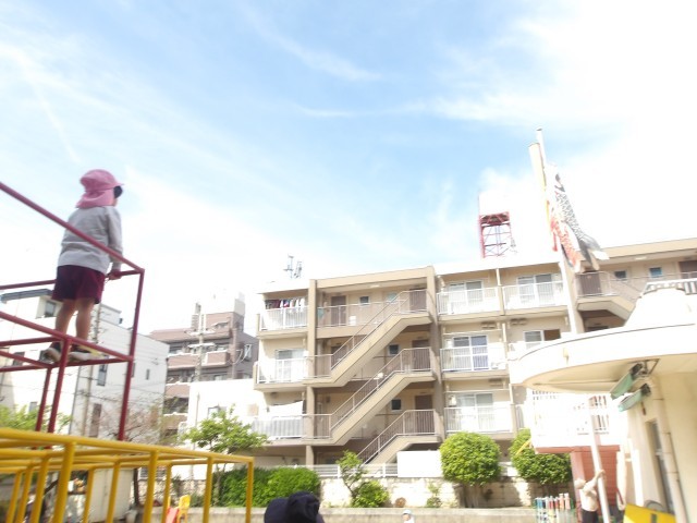 そら組さんが園庭でこいのぼりをあげていました。「やねよーりーたーかーい、、、、」の歌のように幼稚園の屋根よりも高くあがっていきました。もも組のお友達が「よく見えるから!」とジャングルジムに登って、元気いっぱい泳ぐこいのぼりを見ていました。