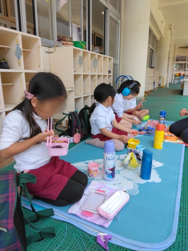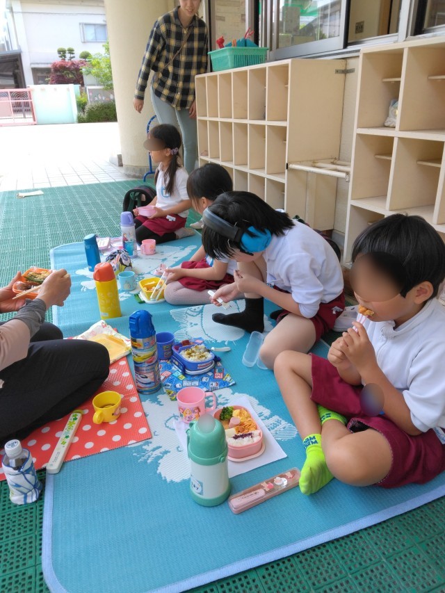 今日はそら組さんがテラスでお弁当。気温の高い日でしたが、日陰で、涼しい風が吹いていてとても心地よかったですね。