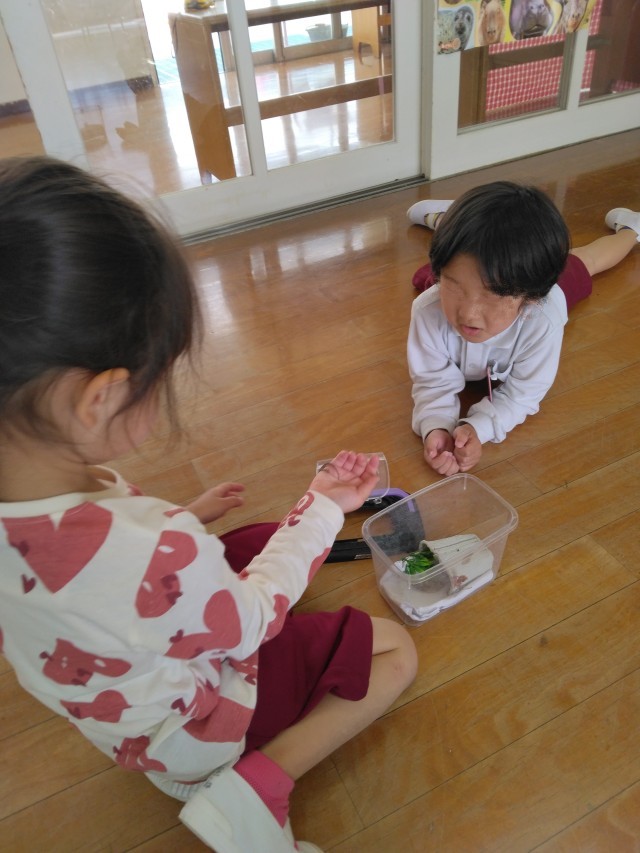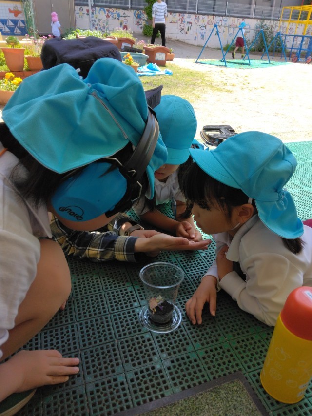 そら組はたまごをもっているダンゴムシを教えてもらって、みんなで観察していました。身近な生き物に興味や関心をもって優しくふれあいながら命の大切さも知らせていきたいと思います。