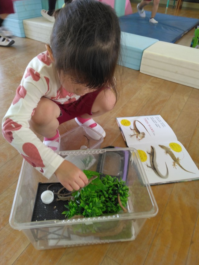 カナヘビや幼稚園で見つけたヤモリの赤ちゃんをとても可愛がっています。毎日霧吹きで水をあげて、ケースをもってお散歩したり、餌をあげたりして「かわいいな」「ぴょんってとんだ」と見ています。
