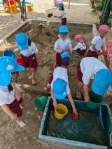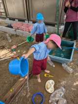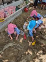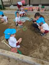 昨日に続いて砂場が盛り上がっていました。水を使って山を固めていったり、砂に水が吸...