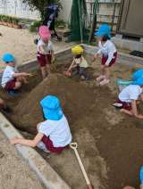 砂場での遊びが更に広がってきました。水を流したり、道(川)を掘っていったりして盛...