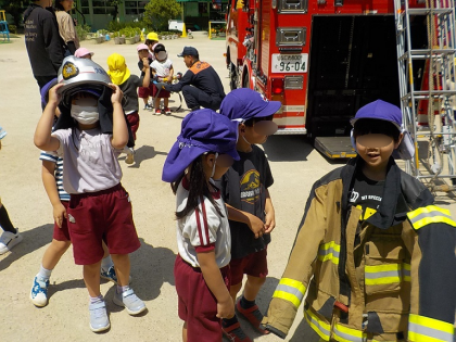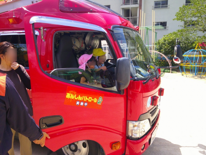 はしごやホースを触らせてもらったり、消防士の方が実際に着ている消防服を着せてもらったり…。そしてなんと、消防車の運転席にも乗せてもらいました!子どもたちは目を輝かせながらポーズをとったりハンドルを握ったりしていました。