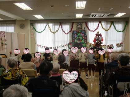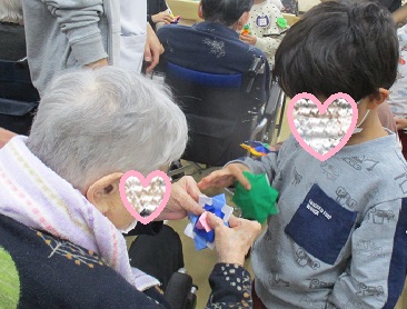 ホームでは歌を聴いていただいたり肩たたきをしたり…あっという間に時間がきてしまいましたが「可愛いねえ」「また遊びに来てね」と手をとり声をかけていただき、折り紙コマのプレゼントまでいただきました。“ボランティア”と言っても、子どもたちもおじいさんおばあさんと触れ合うことで自分たちが大切にされていることを実感できる貴重な経験をさせていただいています。子どもたちの歌声を聴いて「涙が出てくる」とお年寄りの方が目頭を押さえておられるのを見て、きっと心に響くものがあったと思います。