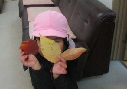 裏庭の畑にお散歩に行っていた3歳児もも組さん。園長室に「見てー!きれい!」と色づいた葉っぱを見せに来てくれました。赤や黄色、きれいな形のものをよく見て集めたのが伝わってきます。「なんかこれいいにおいするねん、におってみて」と五感を通して季節を楽しんでいる子どもたちです。
