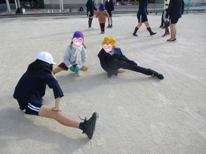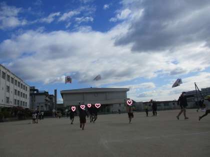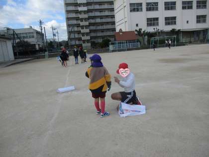 最初にペアになって自己紹介や準備運動をし、いよいよ凧をあげます。「凧持っとくからしっかり走って」「そうそう、上手上手!」と5年生のリードはとても優しく、糸を伸ばしてみたり、引っかかったらほどいてくれたり…としっかりお世話をしてくれました。たくさん走って身体はポカポカ。楽しい凧あげになりました。