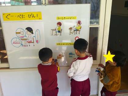 ぐー・ぺた・ぴん! 公開日 2025/02/18 更新日 2025/02/18 幼稚園の様子 1月の保健指導で使用した「正しい姿勢はどっち?」や「骨を丈夫にする食べ物はどっち?」のクイズを保健室前のホワイトボードに掲示していると、〇と×を動かして遊んでいる子がいました。 クイズをしながら、「ぐー・ぺた・ぴん!」と言って正しい姿勢を教えてくれたり、悪い姿勢はどんなところが間違っているのかを指をさして教えてくれたりしました。寒い季節も背筋をしっかり伸ばし、丈夫な体を作ってほしいと思います。 いいね(0)
