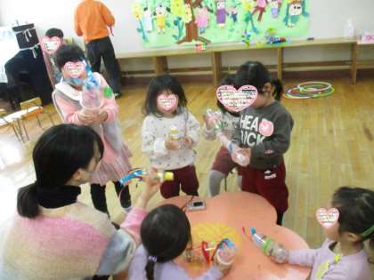 4歳児ひまわり組と3歳児もも組は一緒に素敵なマラカスをつくっていました。「これとこれちょっと音が違う」「かわいくできた!」と友達と一緒に振ることを楽しんでいます。このマラカスは、誰かへのプレゼントだそうですよ。いろいろな活動を通して、修了進級への期待を膨らませています。