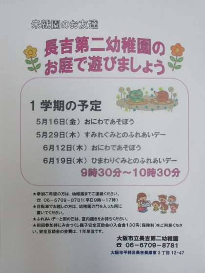 幼稚園に遊びに来ませんか? 公開日 2025/04/28 更新日 2025/04/28 お知らせ 未就園児のお友達、長吉第二幼稚園のお兄さんお姉さんと一緒に遊びませんか? 1学期最初の園庭開放は5/16(金)です。予約は不要です。ぜひぜひご近所のお友達と誘い合って遊びにいらしてくださいね♪何かわからないことがあれば、幼稚園にお電話でお尋ねください。 いいね(0)