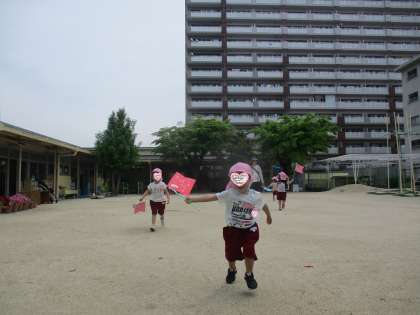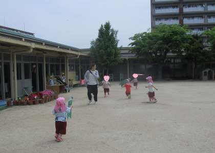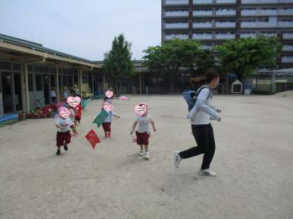 3歳児もも組の子どもたちが、自分のつくったこいのぼりを持って園庭を走っています。風を受けて泳ぐ姿が嬉しくて、何度も何度も「見て見て!」と先生と一緒に走っていましたよ♪