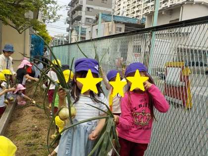 土を掘っていると、玉ねぎの香りもしてきました。今年は沢山実り、みんな一人1個収穫し、取れると嬉しそうに見せてくれました。