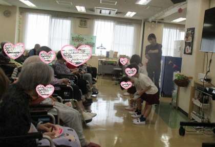 今日は“子どもボランティア”の日。5歳児すみれ組の子どもたちが、特別養護老人ホームに出かけました。「こんなことして一緒に遊びたいな」「プレゼント渡したいな」とクラスで相談し今日を楽しみにしていた子どもたちは、歌声からも自信が感じられ、肩たたきなどでも積極的にかかわろうとしていました。子どもたちから押し花のコースターをプレゼントするとおじいさんおばあさんからは折り紙の手裏剣をいただきました。楽しい時間はあっという間、また11月に遊びに行かせてもらいましょうね。