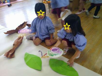 紙皿で殻を作って、封筒で体を作りました。出来上がると、「葉っぱに乗せてあげよう!」「木の上に歩かせてあげよう!」とどんどん想像を膨らませながらつくっている姿がありました。