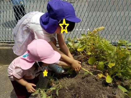 「土の中でかくれんぼしているジャガイモはいないかな?」と声をかけると一生懸命掘り起こして「見つけた!」と嬉しそうに教えてくれ、収穫の喜びをを感じているようでした。