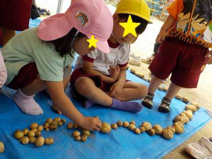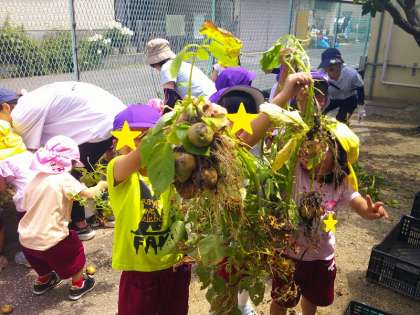 幼稚園の畑でジャガイモ堀りをしました。ジャガイモの蔓を引っ張ると土の中から大小様々なジャガイモが!!。
